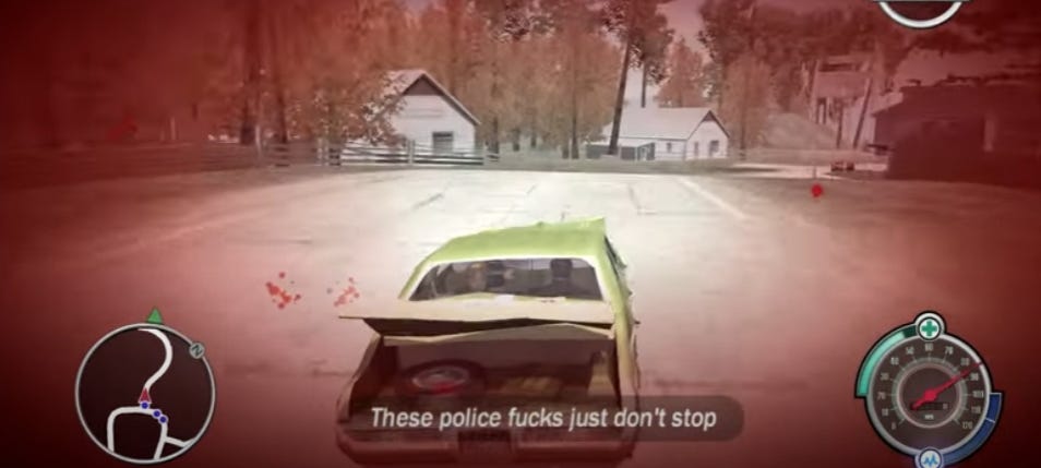 The game puts you in two types of levels: either running & gunning or driving. You can generally kill everyone and be branded a psychopath by the game, or you could just point guns at everybody and occasionally strike a hostage and be deemed a professional. There’s also an in-between classification in the middle, for if you only want to kill people sometimes. You’ll receive one of the game’s three endings based on where you’re classified by the end.