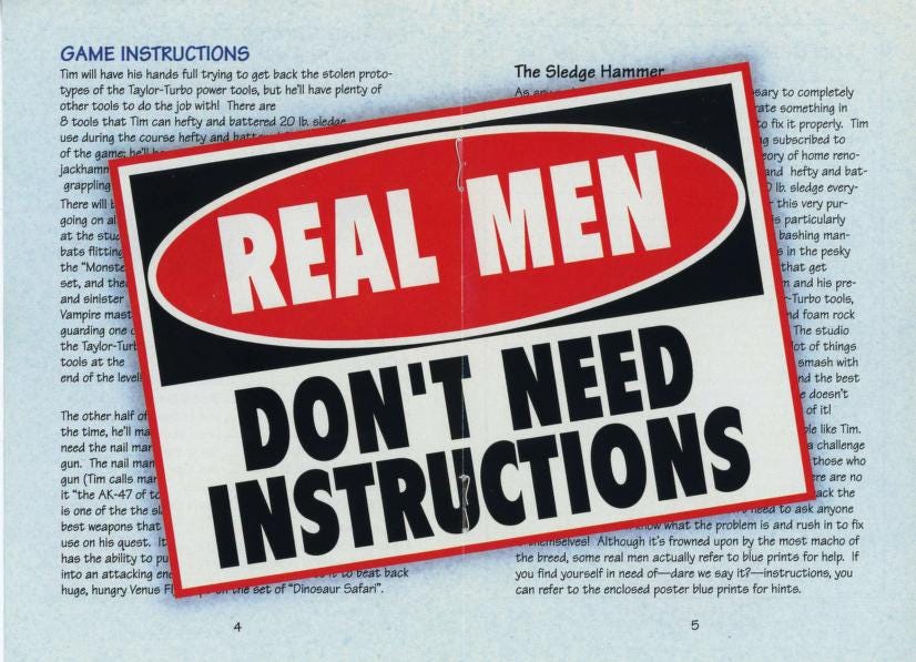 If you look closely, it even looks like they wrote some actual directions and still slapped their 1990-core gag on top of it. Real men might not need instructions, but real gamers (plenty of whom were children) could’ve used the help navigating your weird game, man.