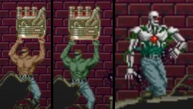 If you read a list of the cameos featured in this game, you might rightfully assume that The Terminator and The Hulk appear separately. As it turns out, when they’re not characters you own, you’re beholden to nothing. So this version of The Terminator turns into The Hulk for a little bit, before you’ve blown his skin completely off. And he throws engine blocks at you the whole time.